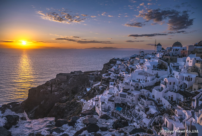 ドーハ到着後、航空機を乗り換えてアテネへ。着後、さらに国内線に乗り換え、キクラデス諸島のサントリーニ島へ。昼食後、紀元前の火山大噴火により町全体が灰に埋もれたアクロティリ遺跡を見学します。また、天候が許せばイアより世界的に有名な夕日をご覧いただけるでしょう。