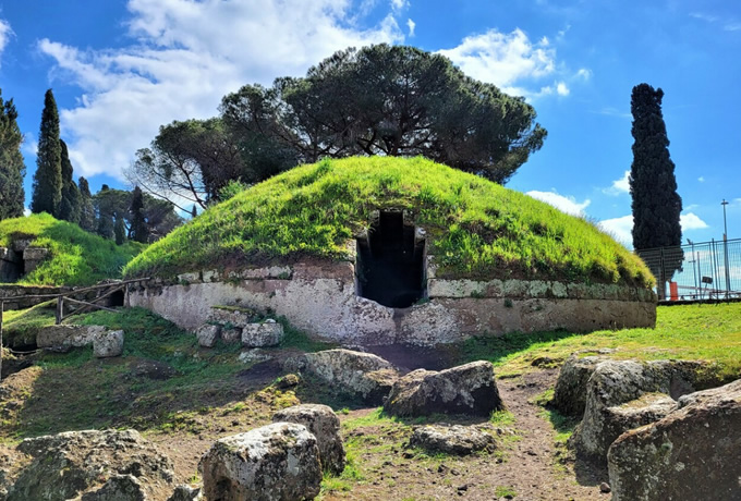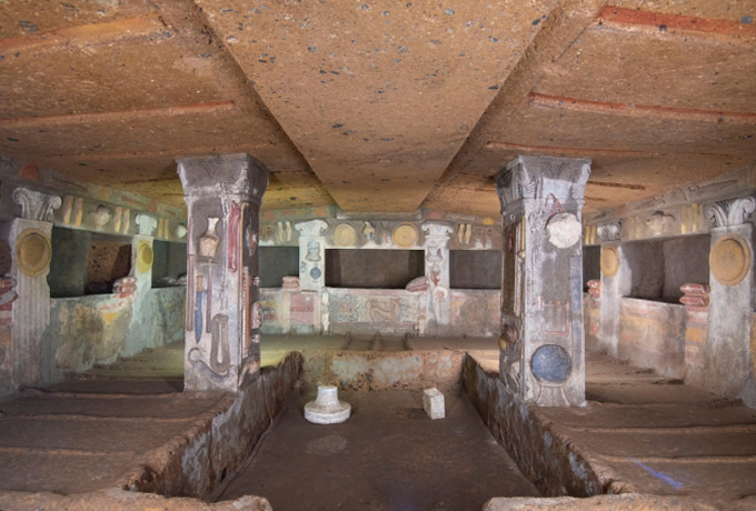 専用車でラテンの由来ともなった古代ラティウムの町・アルデアへ。ネクロポリスを訪問します。ここでは土葬と火葬の両方の墓が見られ、ミネルヴァ・トリトーニアを含む約100体のテラコッタ像などの遺物が発見されています。その後、専用車でチェルヴェテリへ移動し、チェルヴェテリ考古学公園へ。古代世界最大級のネクロポリスの一つである世界遺産バンディタッチャ墳墓群を見学します。