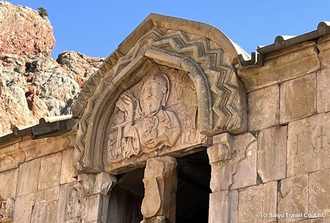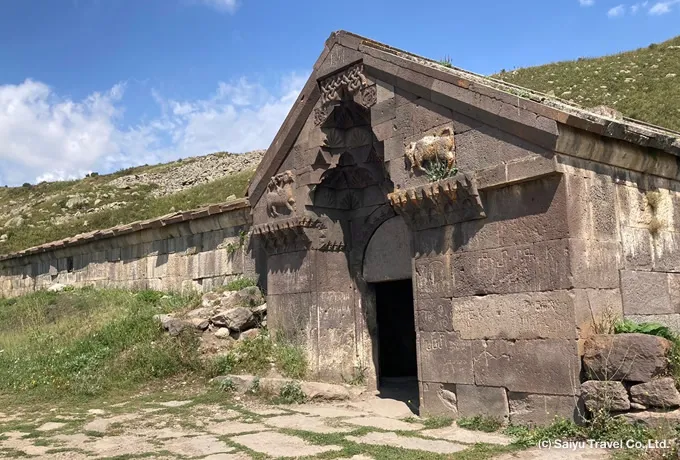 聖ステパノス・ナーセシ教会に刻まれた三位一体のレリーフ標高2,410mのセリム峠に建つセリム峠キャラバンサライは、中世アルメニアの隊商貿易を支えた重要な宿泊施設です。ワヨツ・ゾル地方を南北に貫く交易路上に位置し、シルクロードの支線を往来する商人や巡礼者たちが休息をとる場として機能しました。1332年、オルベリアン家の王子チェサール・オルベリアンとその妻ホリシャフの命により建設が始まり、14世紀前半に完成しました。建物は灰色がかった玄武岩で造られ、3つのホールから成る堅牢な構造を持ちます。内部には石の飼い葉桶を兼ねた柱が並び、広い石板で覆われた屋根からは当時の建築技術の高さが覗えます。正面の壁に刻まれた、権力を象徴するライオンと富を象徴する雄牛の彫刻は、往時の繁栄を物語る意匠です。1950年代に修復され、現在も中世隊商宿の姿をほぼ完全な形で伝えています。