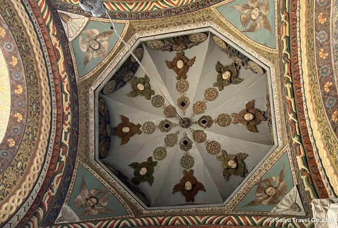 中世写本を収蔵するマテナダランアルメニア使徒教会の総本山であり、アルメニアが301年にキリスト教を国教とした歴史の中心地です。4世紀初頭、王ティリダテス3世と聖グレゴリウスによって最初の大聖堂が建立されたと伝えられ、世界最古級のキリスト教大聖堂のひとつとされています。現在の建物は4世紀を起源とし、その後の増改築を経て17世紀の大改修で現在の姿が整えられました。中央にドームを戴く十字形平面を基本とし、四つの後陣と四本の柱で支えられる構造は、アルメニア教会建築の原型となる形式です。この建築様式はビザンチン世界をはじめ、広くキリスト教建築に影響を与えました。内部にはフレスコ画が残り、18世紀にはナガシュ・ホヴナタンとその一族による装飾が施されています。信仰の場であると同時に、アルメニア美術と建築史を語る重要な空間でもあります。