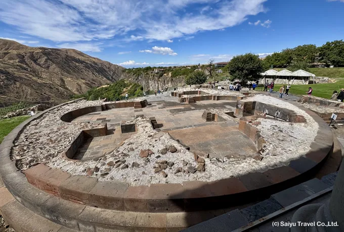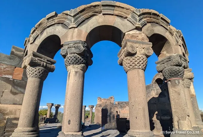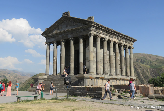 1世紀後半に建立された、アルメニアに現存する唯一のギリシャ・ローマ様式建築です。周囲を柱廊が囲むペリプテロス型で、正面6本・側面8本のイオニア式円柱を備えます。西アジアやシリアの装飾芸術の影響を受けた精巧な意匠は、当時の高度な石工技術を物語っています。神殿は光と真実を司るミフル(ミトラ)神に捧げられ、内部には神像が安置されていました。301年にアルメニアがキリスト教を国教とした後も破壊を免れ、古代異教時代を今に伝える貴重な存在です。 周辺には、7世紀建立の聖シオン教会跡(1679年の地震で崩壊)や、精緻なモザイク画が残る王宮浴場跡が残り、異教時代からキリスト教時代への歴史の重なりが感じられる場所です。