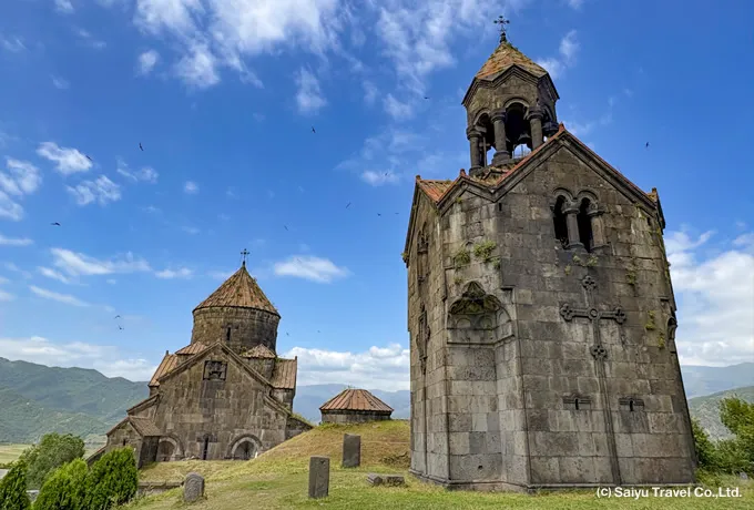ロリ地方の山間に位置するアフパト修道院とサナイン修道院は、10〜13世紀にかけて繁栄した中世アルメニアの宗教・学問の中心地で、1996年に世界遺産に登録されました。いずれもバグラトゥニ朝の保護のもと発展し、神学・哲学・自然科学の教育や写本制作が行われた知の拠点でもありました。 深いデベド渓谷を挟んで建つ両修道院は、石造建築の完成度の高さで知られています。重厚な聖堂、ガヴィット(前室)、鐘楼、回廊、食堂などが複合的に配置され、単なる礼拝施設ではなく、自給自足の修道共同体として機能していたことがわかります。内部には繊細な浮彫装飾やハチカル(十字石)が残り、精神性と石工技術の高さを今に伝えています。