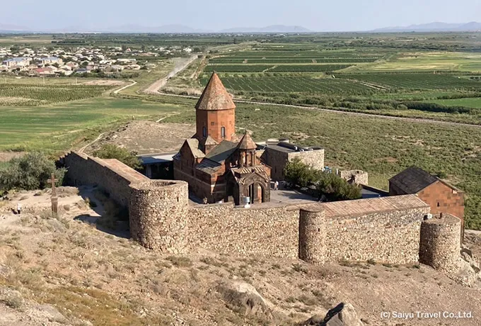 エチミアジン大聖堂ポーチ天井の装飾(17〜18世紀)トルコ国境近くのアララト平原に位置する修道院で、雄大なアララト山を正面に望む絶景が広がります。現在アララト山はトルコ領にありますが、アルメニア人にとって民族と信仰の象徴であり、ここはその姿を最も美しく望む場所の一つとされています。この修道院は、アルメニアが世界初のキリスト教国となるきっかけとなった聖グレゴリウスの伝承で知られています。聖グレゴリウスは、キリスト教を広めた罪により、深い地下牢(ヴィラップ)に13年間幽閉されたと伝えられます。修道院名の「ホル・ヴィラップ」は「深い穴」を意味し、現在も聖母マリア教会(17世紀半ば建立)の脇に、深さ約6メートルの地下牢が残り、急な階段を下りて見学することができます。