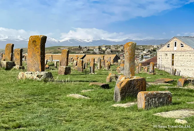 セヴァン湖南岸のノラドゥーズ村は、古代から続く集落で、伝承では紀元前700年頃に創建されたとされます。ここにはアルメニア共和国最大級のハチカル(十字石)群が残され、数百基におよぶ石碑が草原に立ち並びます。墓地には十字架を刻んだハチカルだけでなく、平板墓石も多く残り、そこには狩猟や農作業、宴席の場面など、当時の暮らしや社会の様子が彫り込まれています。