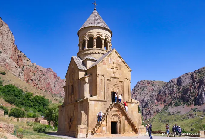 ワヨツ・ゾル地方の断崖に囲まれて建つノラヴァンク修道院は、12〜14世紀に宗教・文化・教育の中心地として栄えた中世アルメニアを代表する修道院で、有力貴族オルベリアン家の庇護のもとで発展しました。精緻な浮彫装飾で知られ、特に2階へ続く急な外階段を持つスルプ・アストヴァツァツィン聖堂は修道院を象徴する存在です。とりわけ、この地で活動した芸術家モミクによるハチカル(十字石)や浮彫装飾は、写実性と象徴性を併せ持ち、中世アルメニア美術を代表する作品群として高く評価されています。1840年の地震で被害を受けましたが、1990年代から2001年にかけて修復が進められ、現在は中世アルメニア建築の重要な遺産として保存されています。